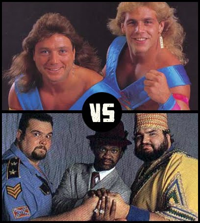 In tonight's match, however, they square off against the damage inducing duo known as The Twin Towers (Big Boss Man and Akeem). Akeem (formerly known as the One Man Gang) was an ill-conceived parody of black stereotypes managed by Slick, a similarly stereotypical "heel." Alongside the Big Boss Man, they fought a series of high profile matches against the likes of Hulk Hogan and Macho Man, Demolition and (of course) The Rockers. Can The Rockers high-flying trump the titanic raw power of The Twin Towers? Watch the video above and find out!